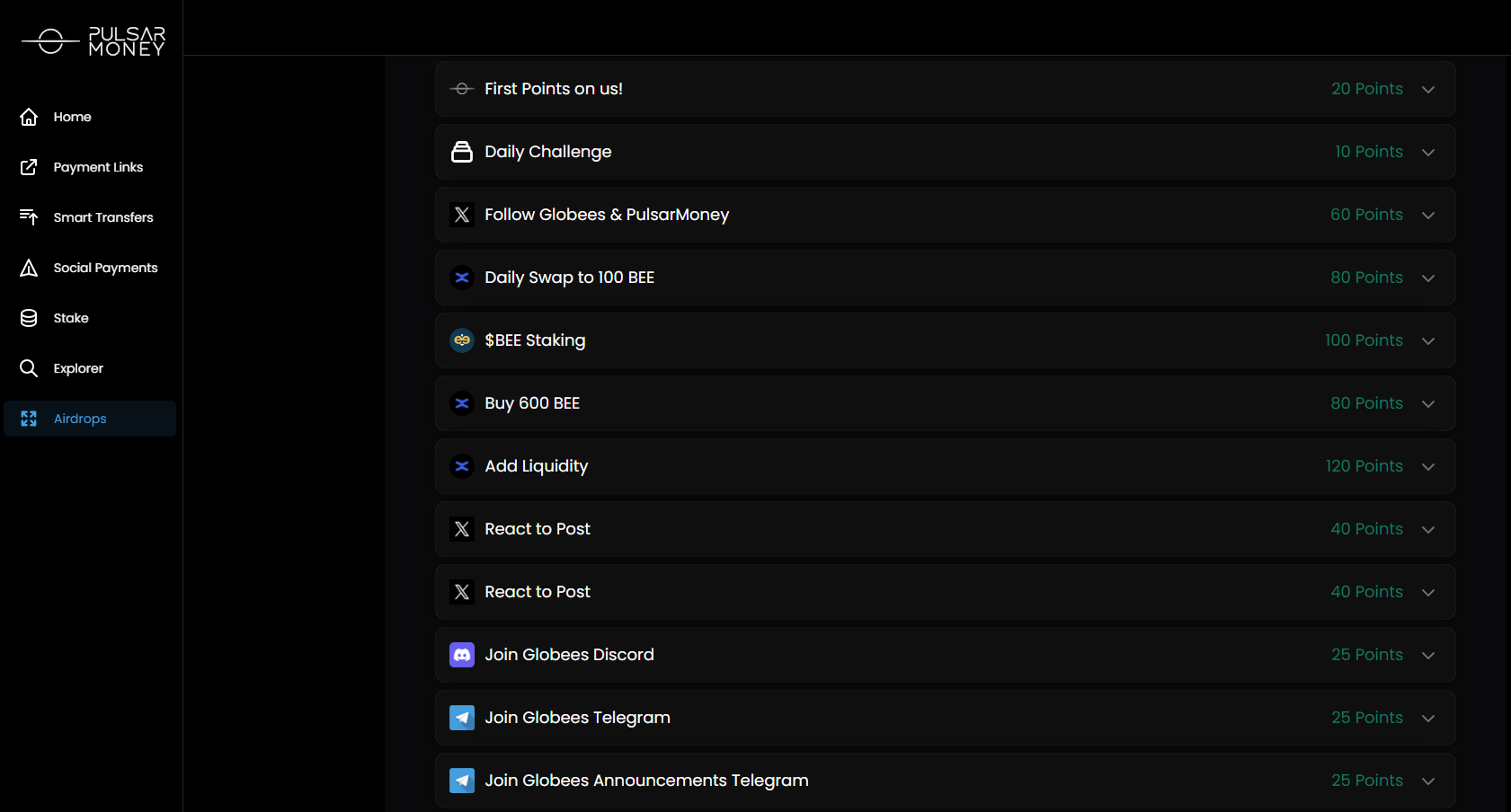Pour participer à l’airdrop de Globees, vous devez réaliser un paiement social en BEE token via Pulsar Money. Pour plus d’informations sur comment réaliser un paiement social en BEE, vous pouvez consulter le tutoriel disponible sur le site de Pulsar Money.