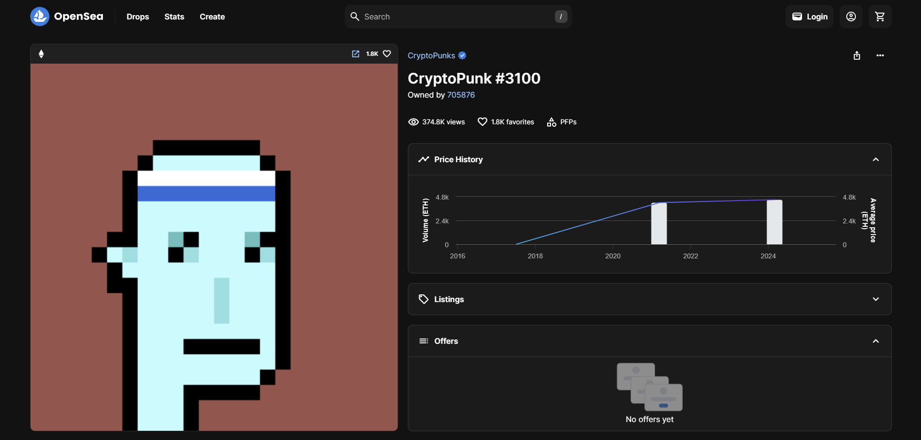 Chaque CryptoPunk a sa propre page de profil qui affiche ses attributs uniques ainsi que son statut de propriété.