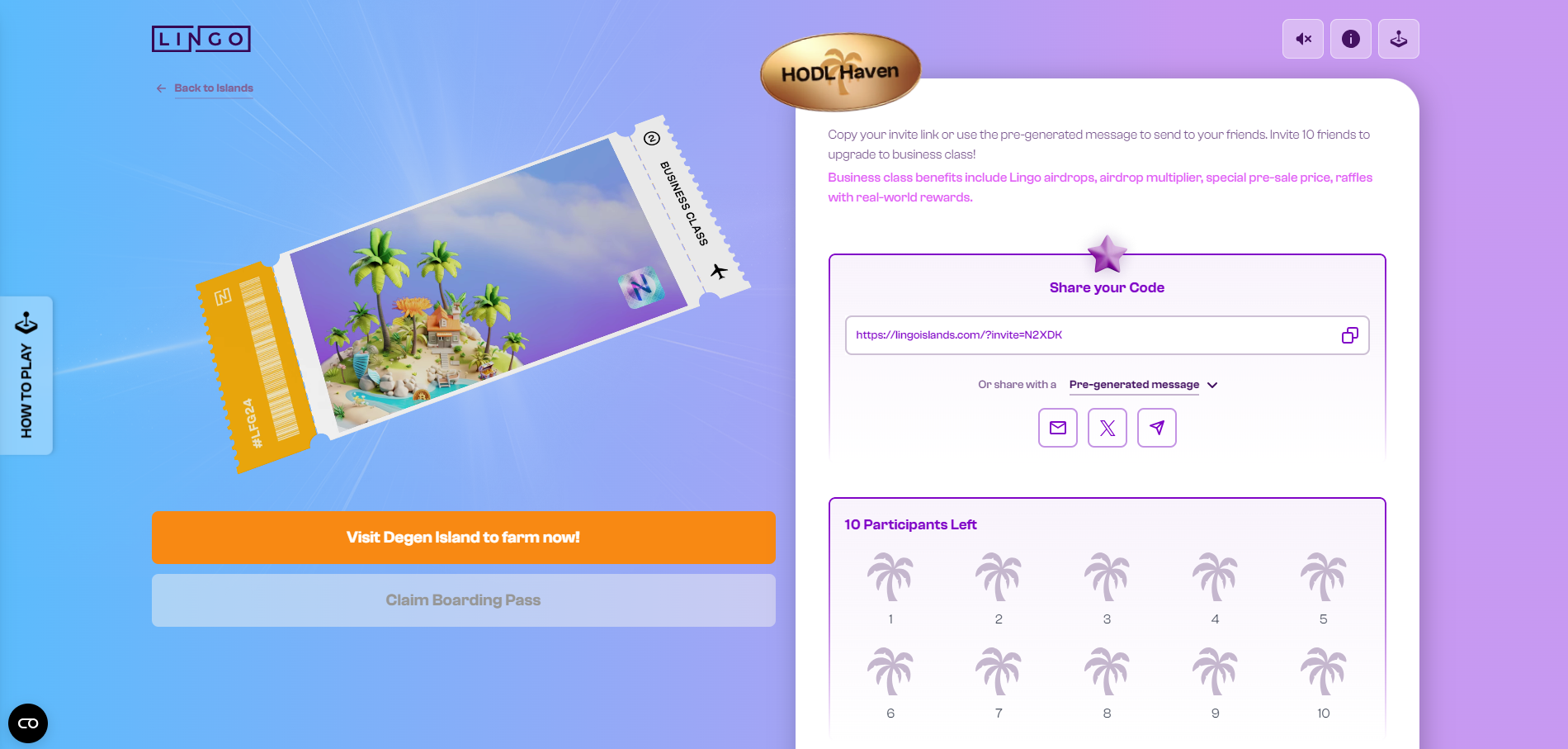 Hoddle Haven offre des avantages pour les utilisateurs qui invitent leurs amis. En invitant 10 amis, vous pouvez passer à la classe affaires, ce qui inclut des airdrops Lingo, des multiplicateurs d’airdrop, des prix de prévente spéciaux, et des tirages au sort avec des récompenses réelles.
