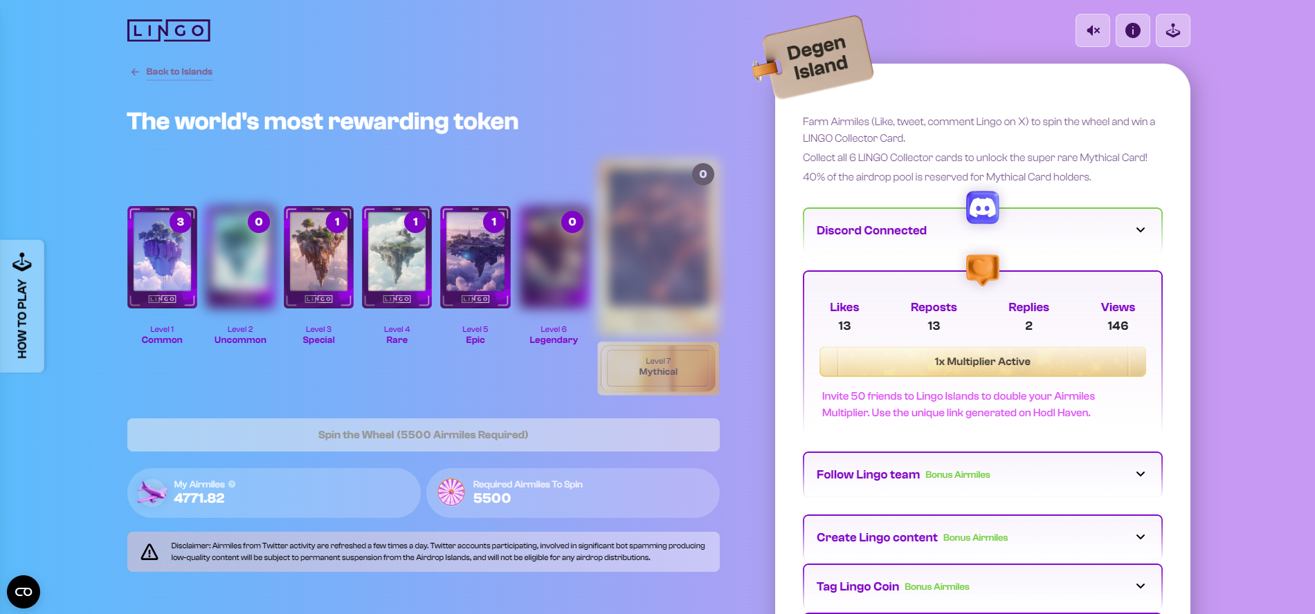 Sur Deegan Island, vous pouvez cultiver des miles aériens en aimant, commentant et partageant des tweets sur X. Vous pouvez également créer du contenu éducatif sur Lingo pour gagner des miles aériens supplémentaires. Collectez toutes les cartes de collection Lingo pour débloquer la carte mythique super rare, qui donne accès à 40 % du pool d’airdrop.