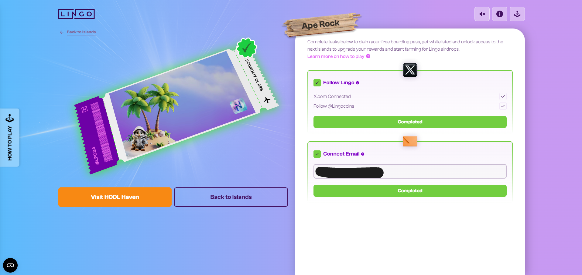 Ape Rock est la première île que vous pouvez explorer. Vous devez simplement connecter votre compte X et vérifier votre email pour recevoir votre carte d’embarquement.